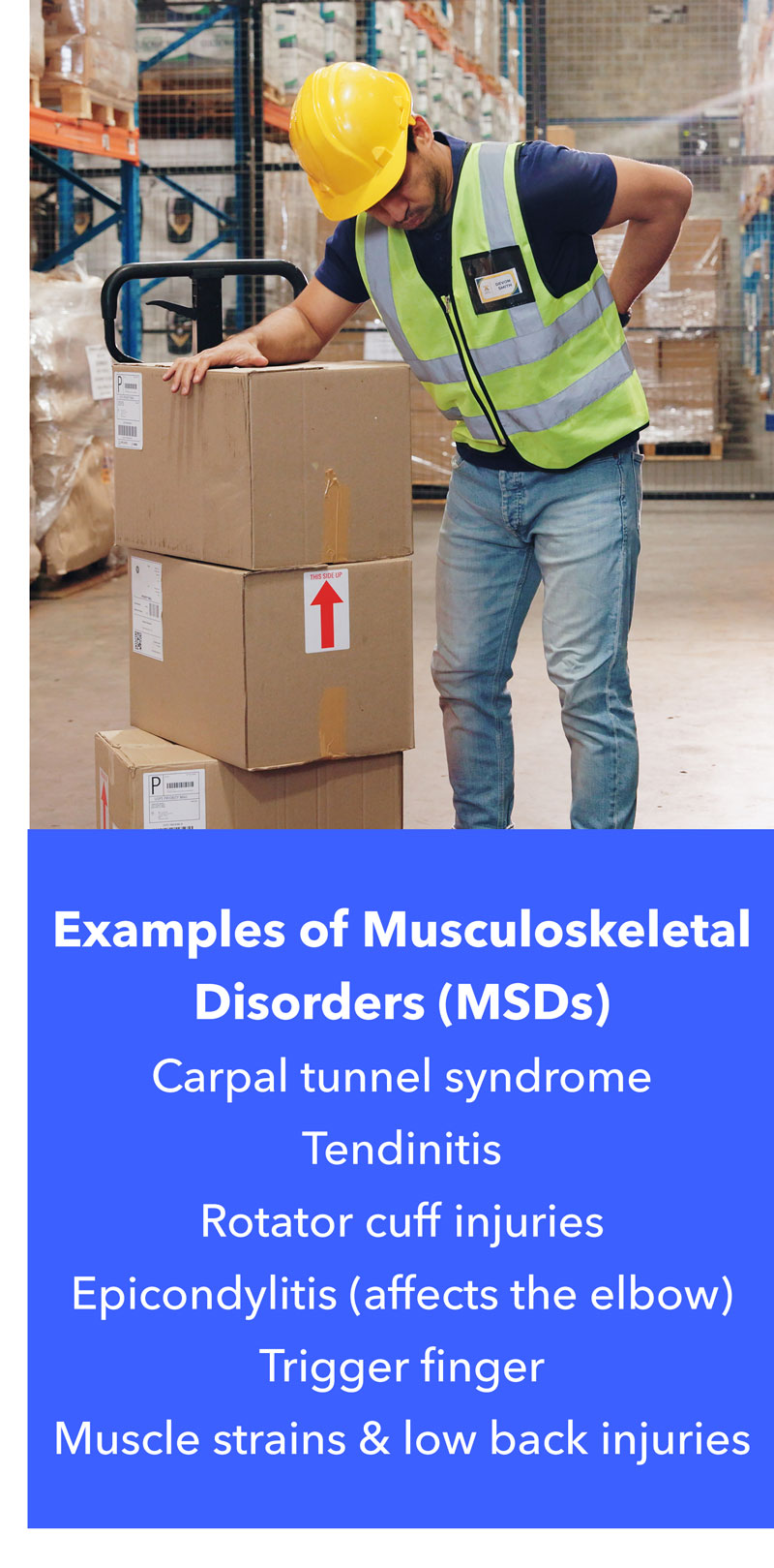 Musculoskeletal disorders (MSDs), such as back pain and carpel tunnel, are the most common workplace injuries.